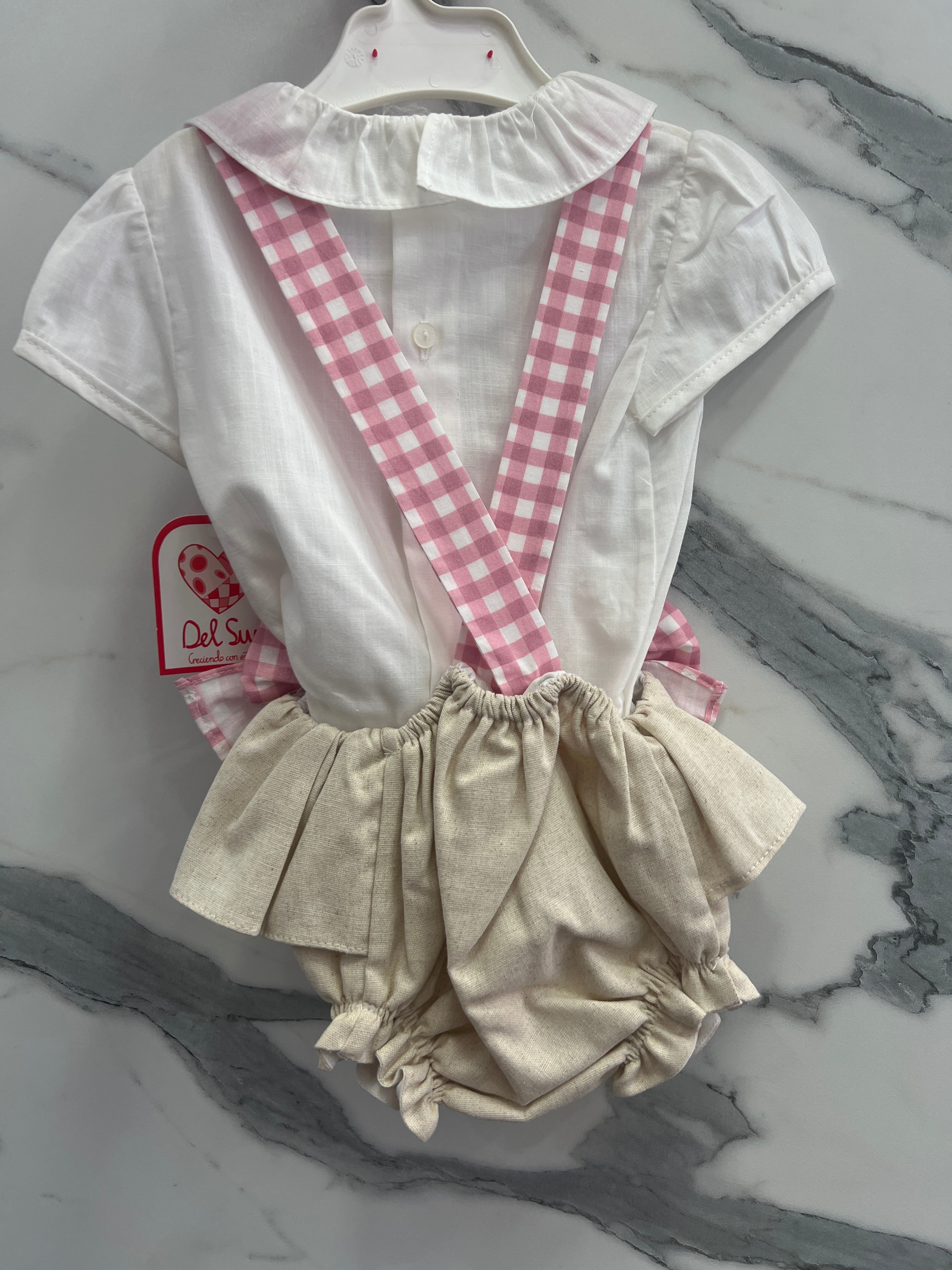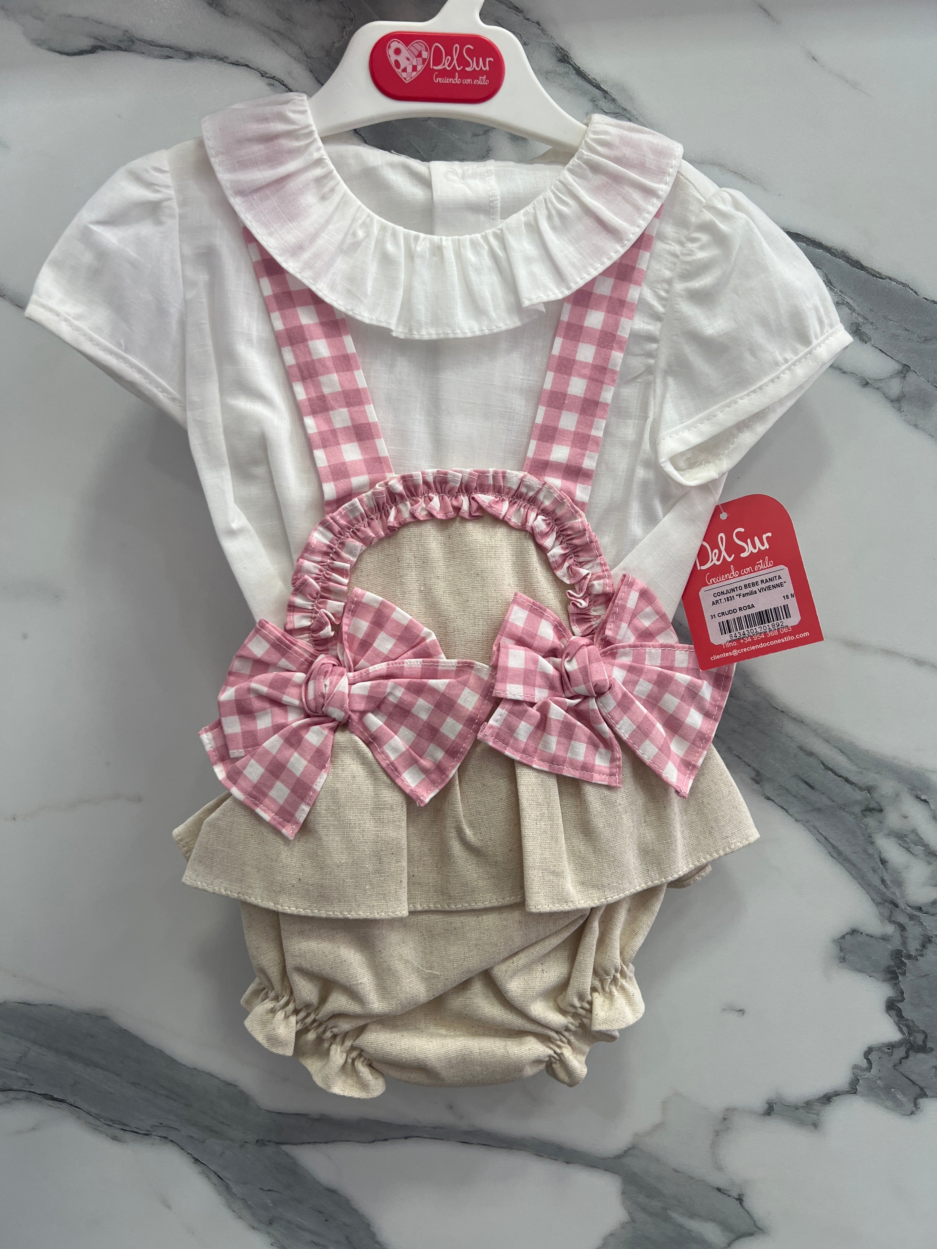-Cotton dungarees in plain beige linen effect with pink checked bows and braces.