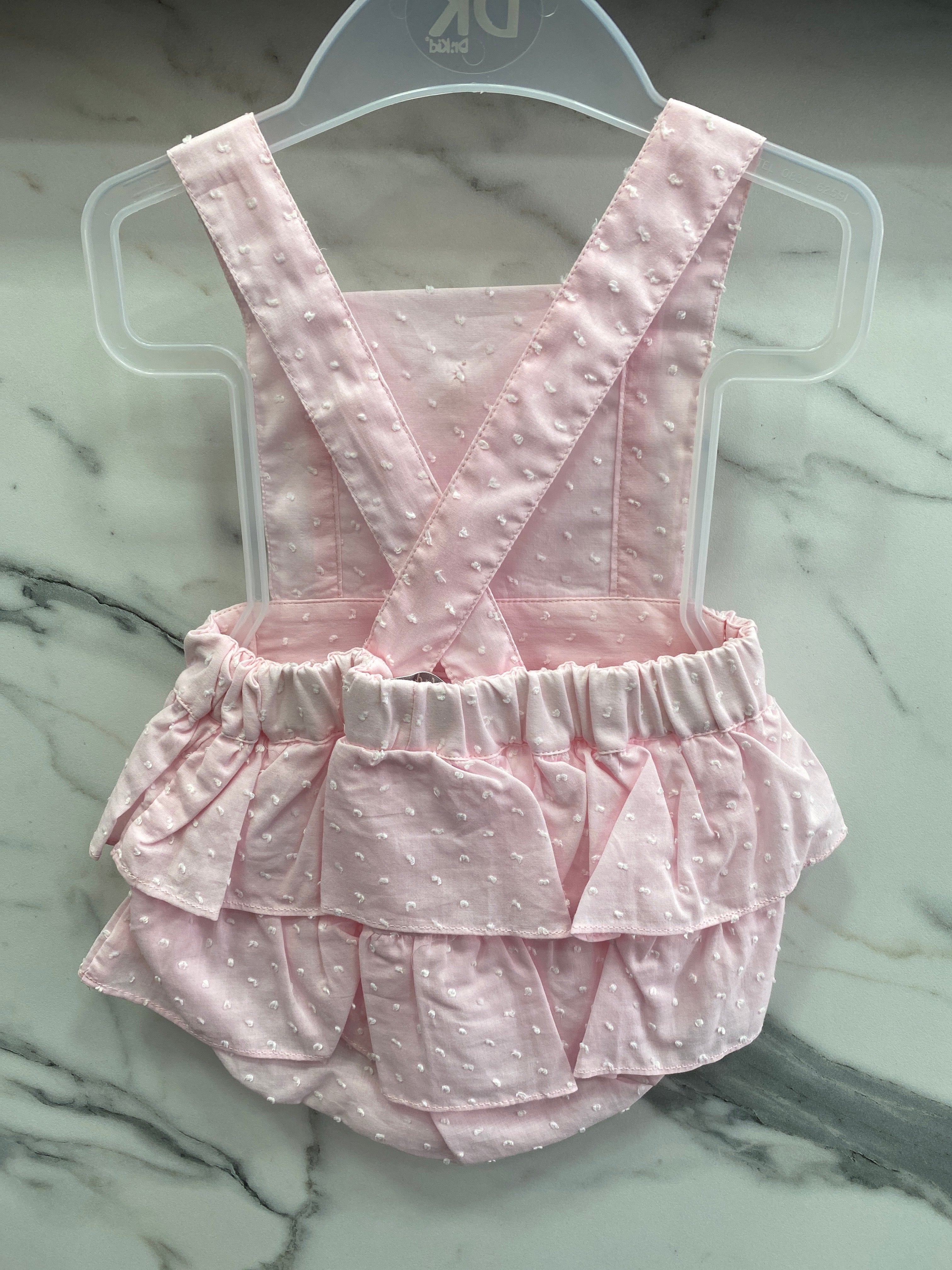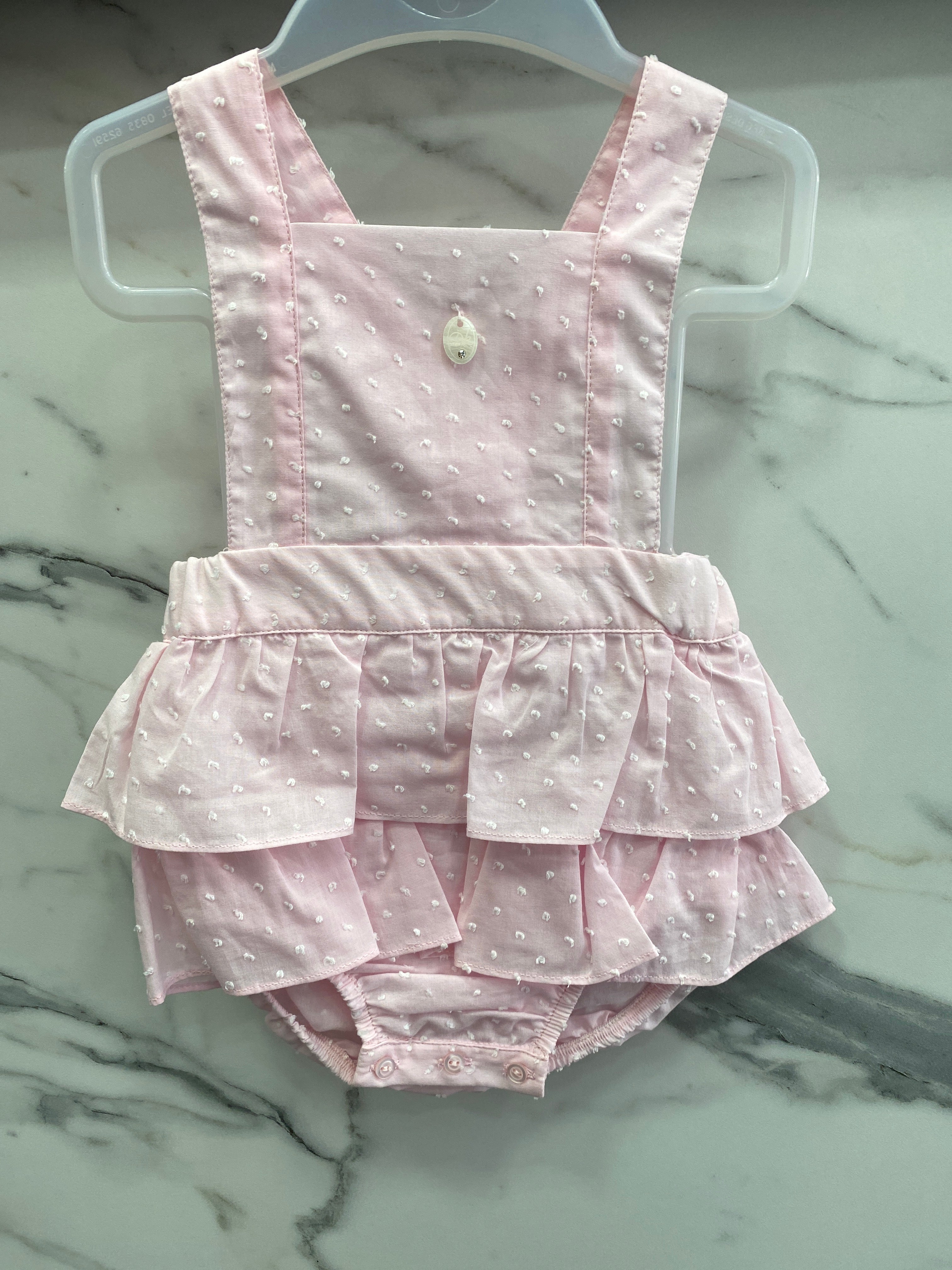 Whole romper with flounces and cross on the back, pink with white plumetis.