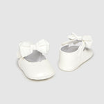 Scarpe per neonata dallo stile classico. Un ever green per uno stile elegante. Materiale esterno effetto pelle. Suola leggera e morbida. Chiusura con velcro regolabile che garantisce una migliore aderenza del piede. Fiocco decorativo.