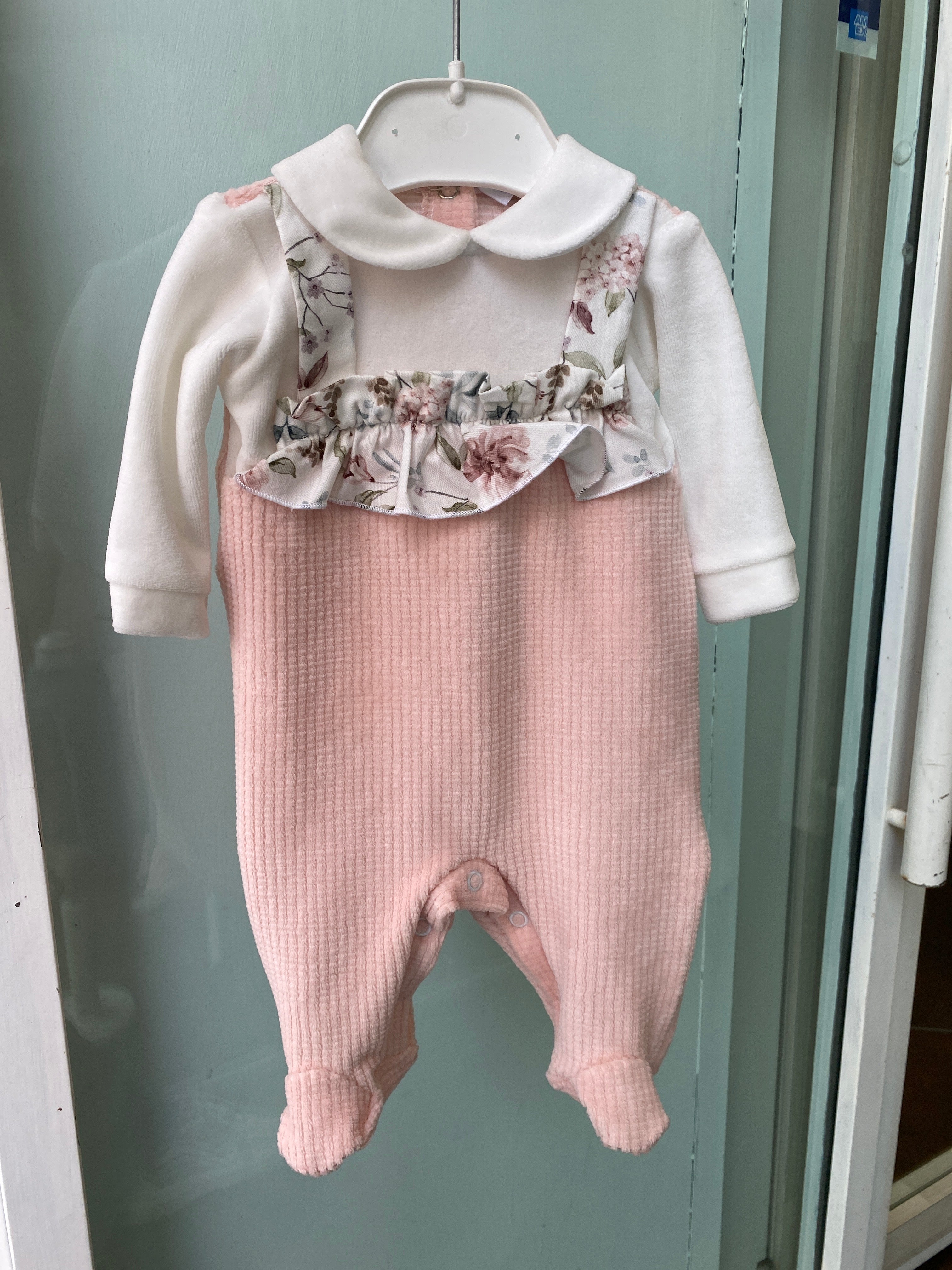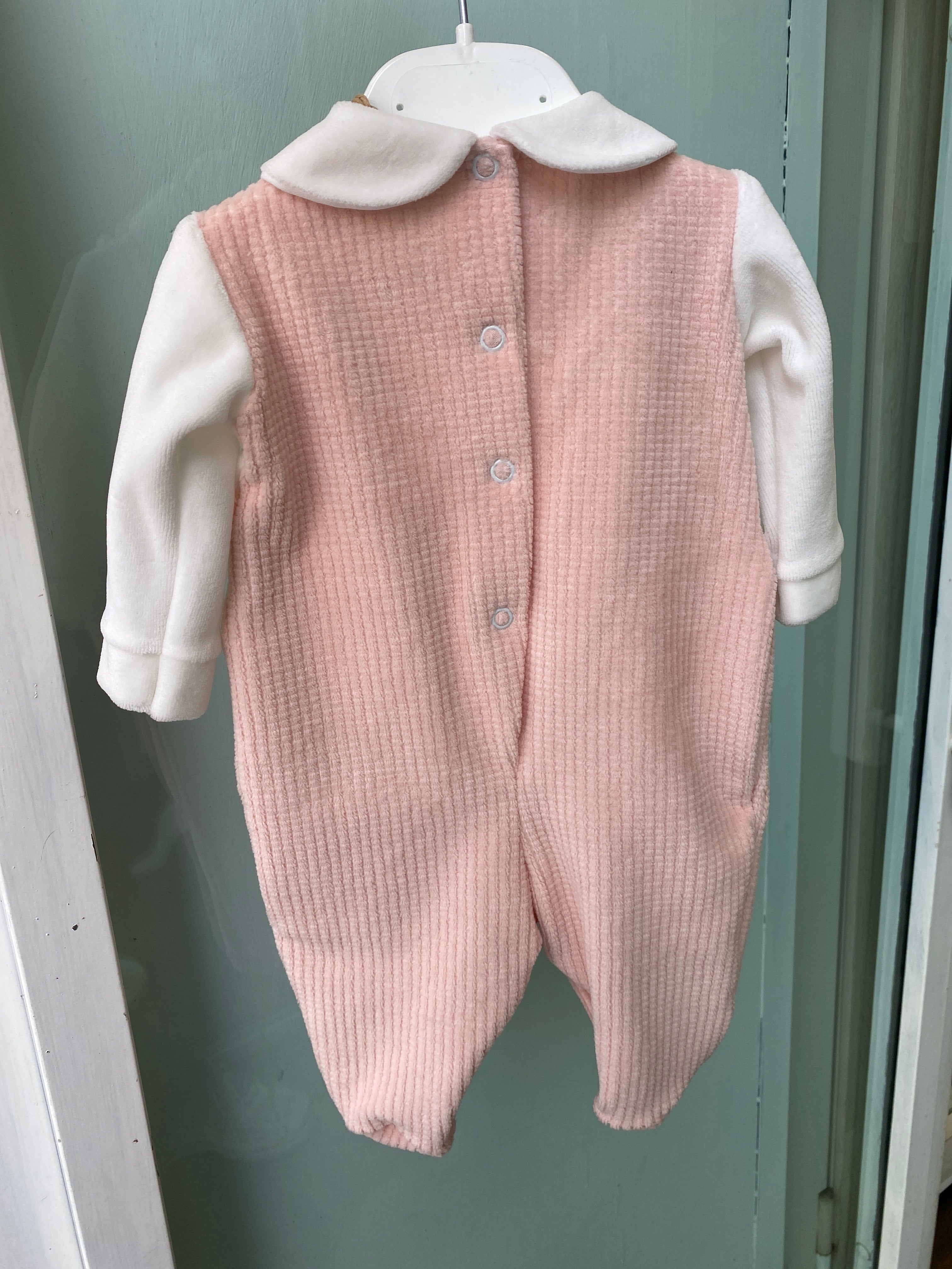 Questa tutina intera in ciniglia effetto salopette è l'outfit perfetto per far sentire la tua neonata elegante e alla moda sin dai primi giorni. Con la sua rouche stampata sul petto in cotone, è l'ideale per ogni occasione. Aggiungi un tocco di stile al guardaroba della tua piccola con la tutina BEBE' MARGO'.