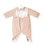 Questa tutina intera in ciniglia, arricchita da ricami raffinati sul davanti, è ideale per i primi giorni della neonata. Realizzata con materiali morbidi e caldi, assicura comfort e protezione delicata sulla pelle sensibile del bambino. Un capo elegante e funzionale, perfetto per completare il corredino essenziale.