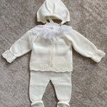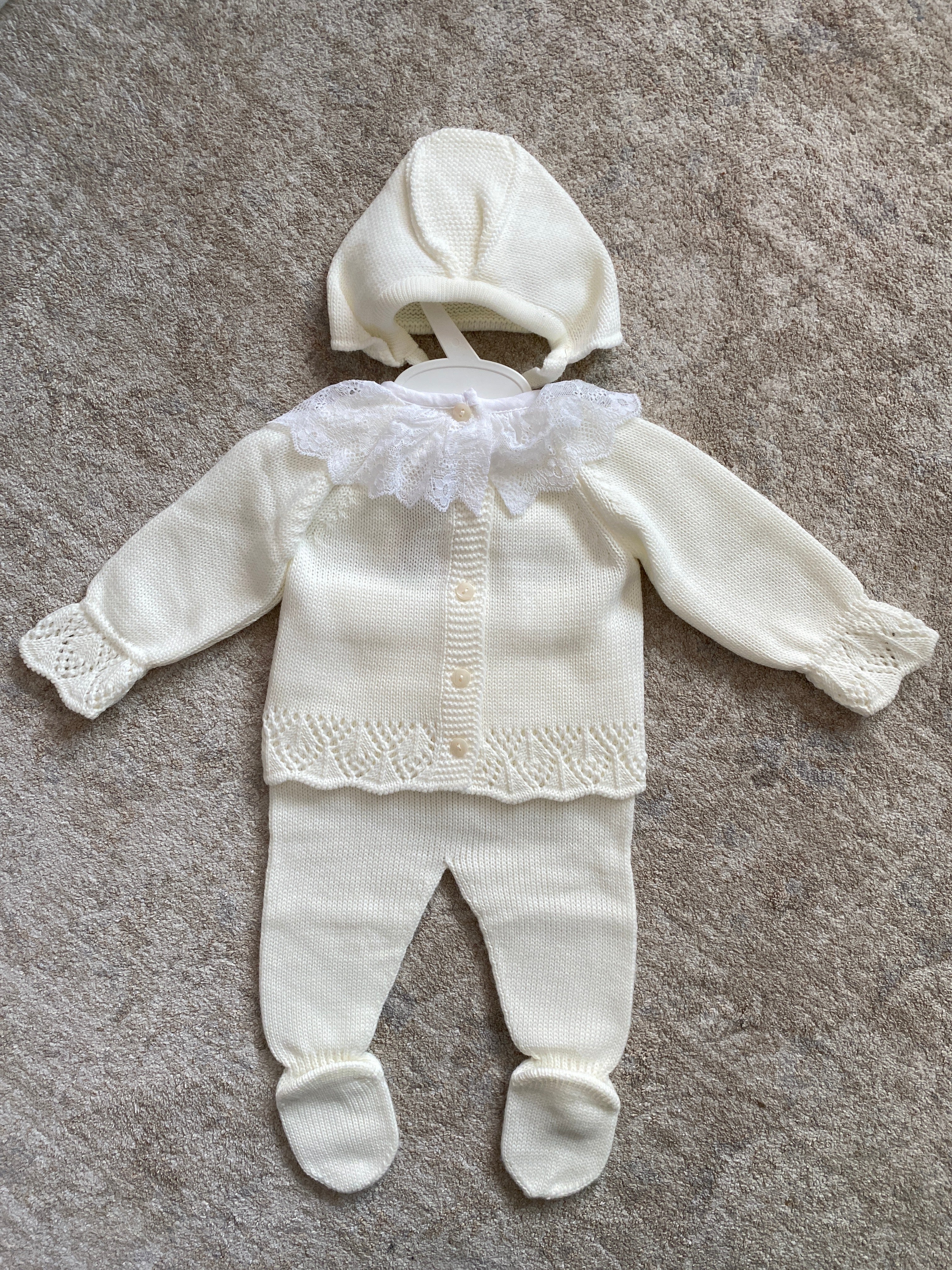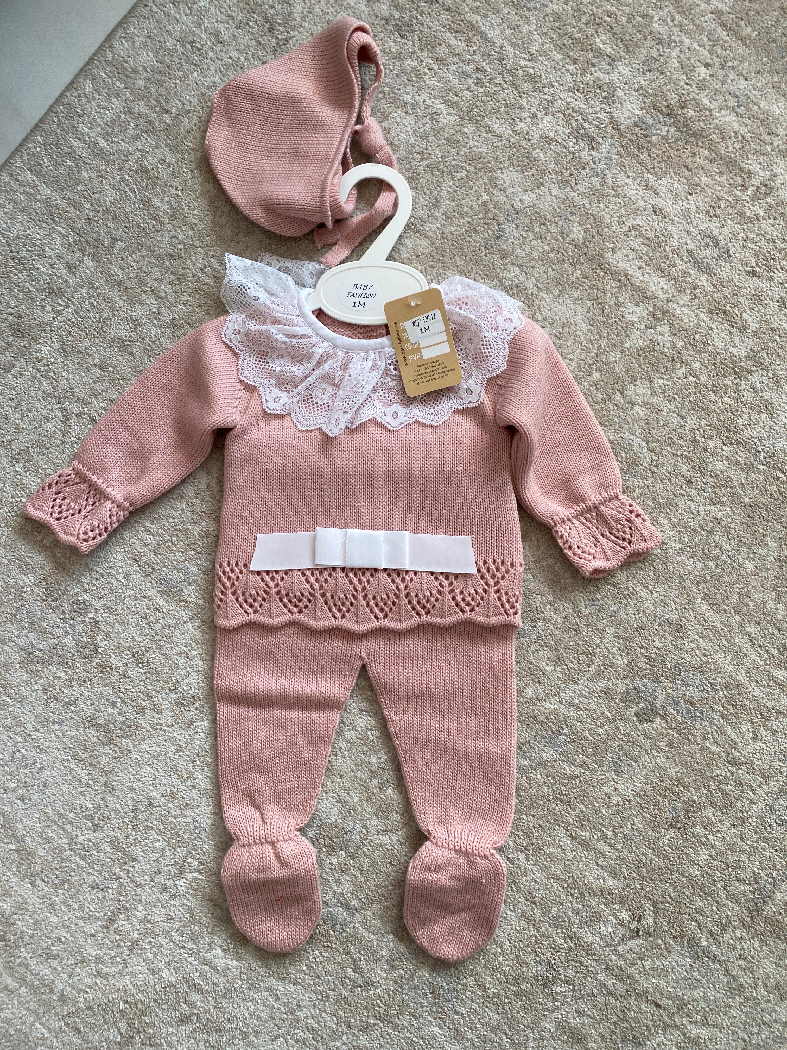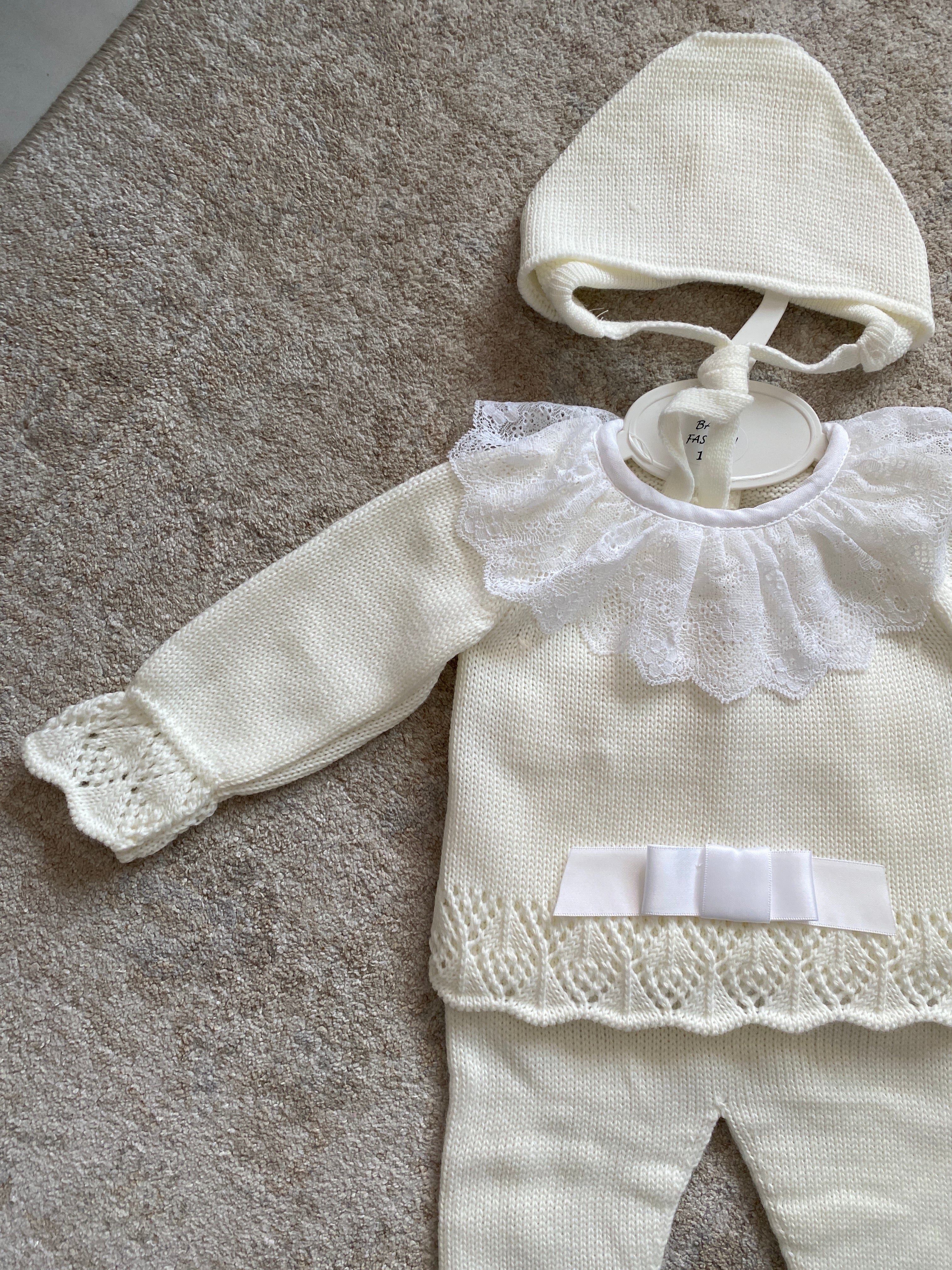 Questa tutina spezzata invernale per neonata è realizzata in morbido tessuto, ideale per garantire comfort e calore durante i mesi freddi. Il colletto tondo in pizzo aggiunge un tocco elegante, mentre il fiocco sul davanti dona delicatezza al capo. Completa di cuffia coordinata, questa combinazione pratica è perfetta come corredino per accudire la tua piccola con stile e cura.