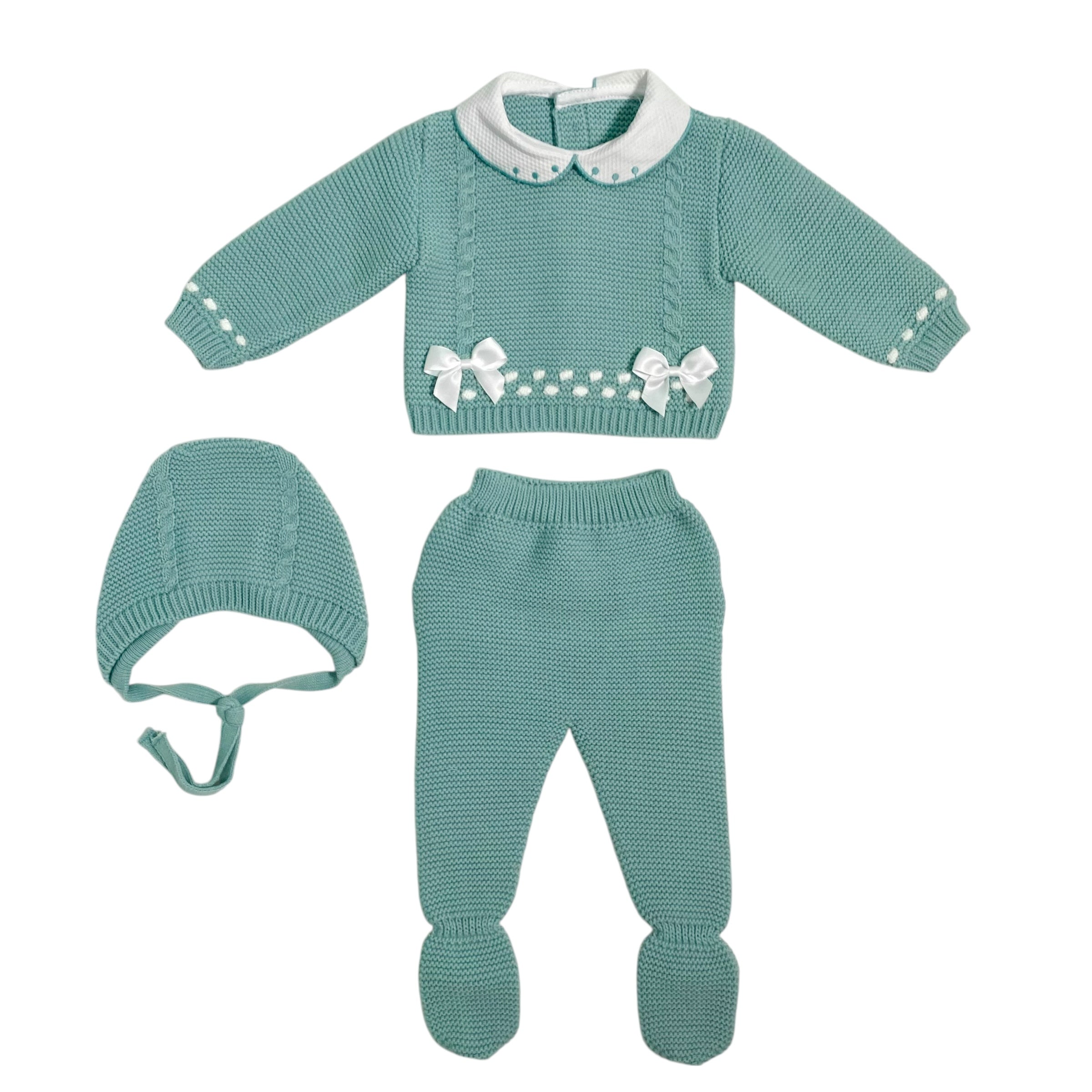 Questa tutina spezzata invernale per neonata è realizzata in morbido tessuto, ideale per garantire comfort e calore durante i mesi freddi. Il colletto tondo in piquet ricamato aggiunge un tocco elegante, mentre i fiocchi sul davanti donano delicatezza al capo. Completa di cuffia coordinata, questa combinazione pratica è perfetta come corredino per accudire la tua piccola con stile e cura.
