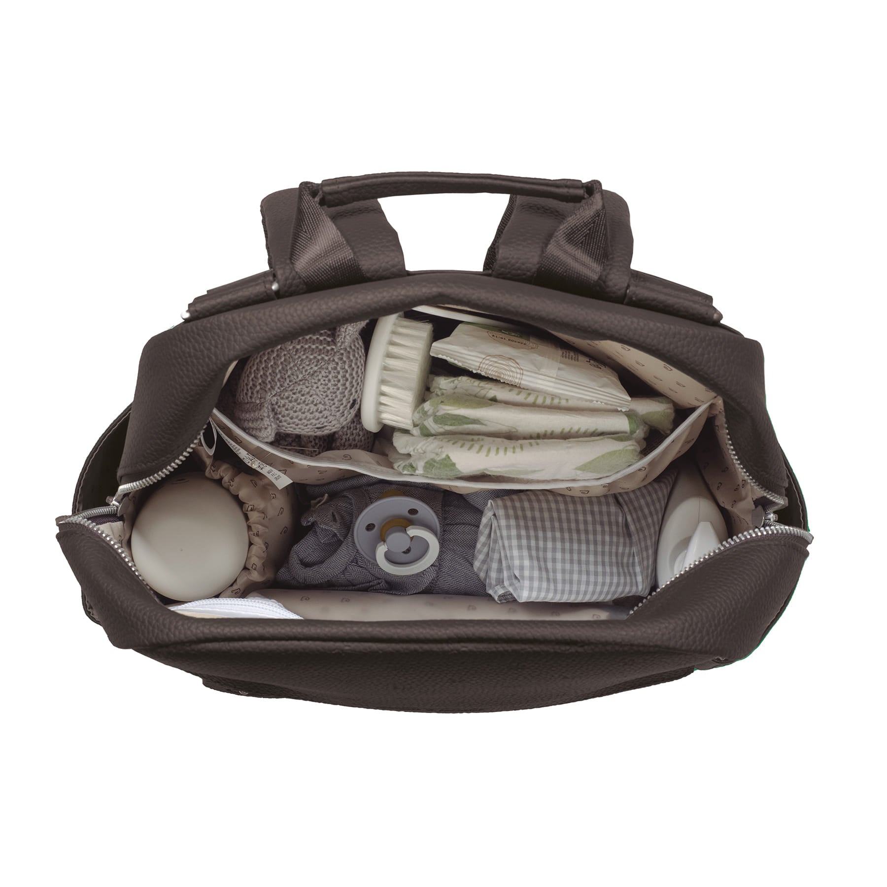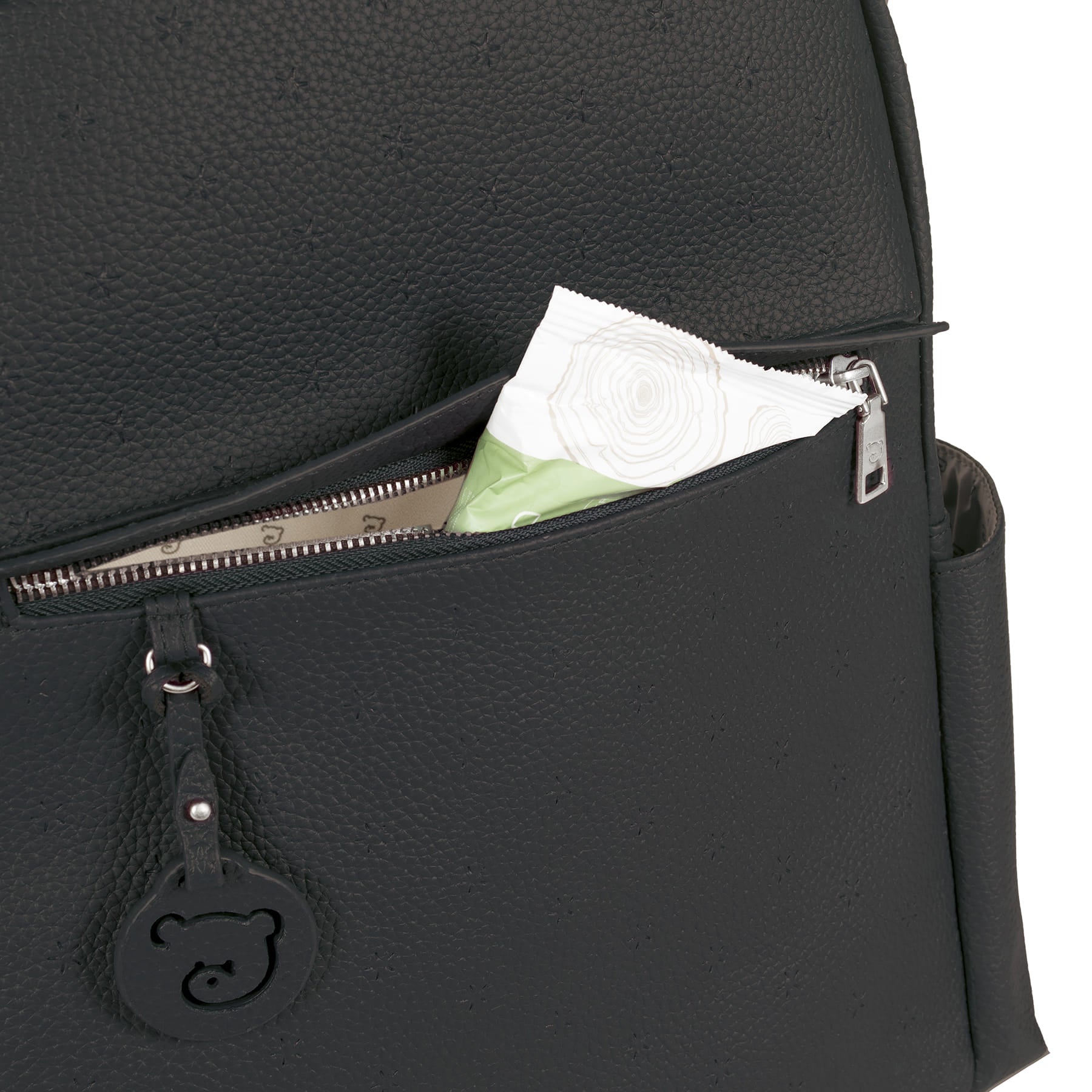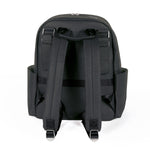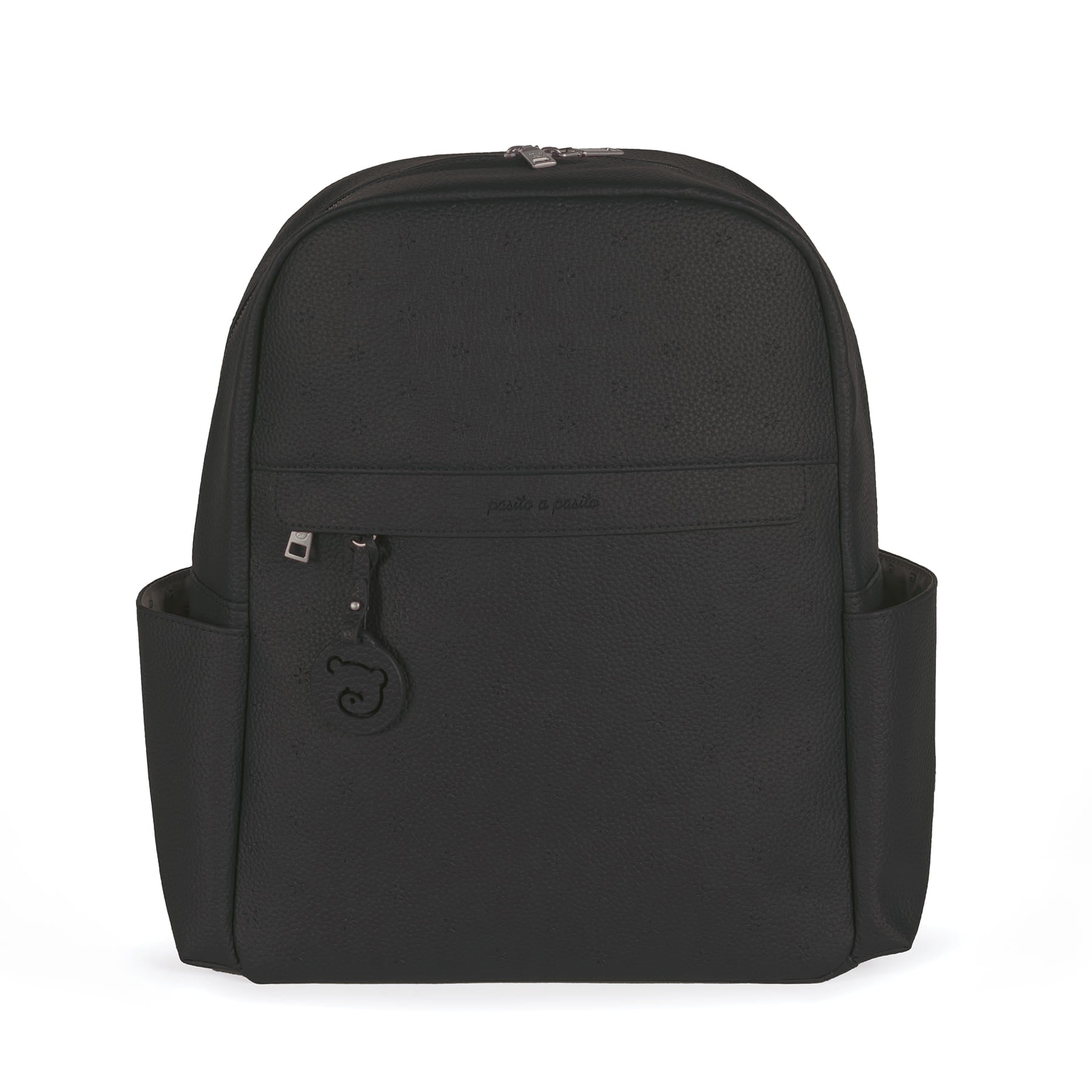 Spacious and stylish, the changing backpack from the London line in black eco-leather with tone-on-tone stars pattern in bas-relief, logo pendant, side and front pockets. lined inside with additional pockets so you can store objects at their best, shoulder straps on the back and hooks for the stroller. inside, the backpack also offers a comfortable changing mat as a gift.