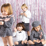 Questo elegante completo in bouclé per neonata comprende una raffinata culotte glitter rosa e un mini abito in bouclé con delicati inserti in tulle. Perfetto per le occasioni speciali, unisce comfort e stile grazie ai materiali di alta qualità e alla cura dei dettagli, garantendo una vestibilità impeccabile e un look sofisticato per i più piccoli.