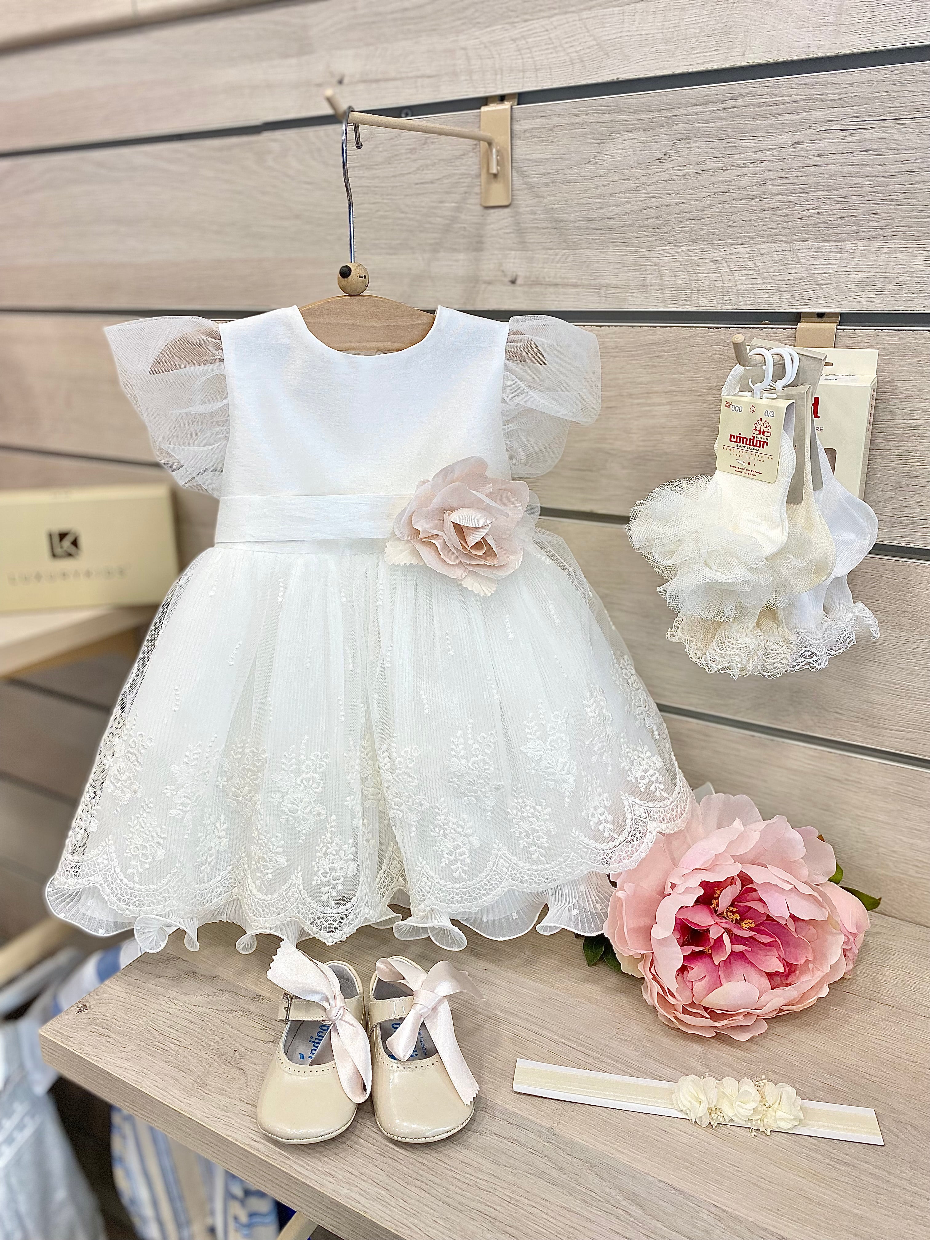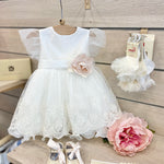 Abito elegante cerimonia con corpetto in rasi panna e gonna plissettata con applicazione di strato in pizzo sovrastante.