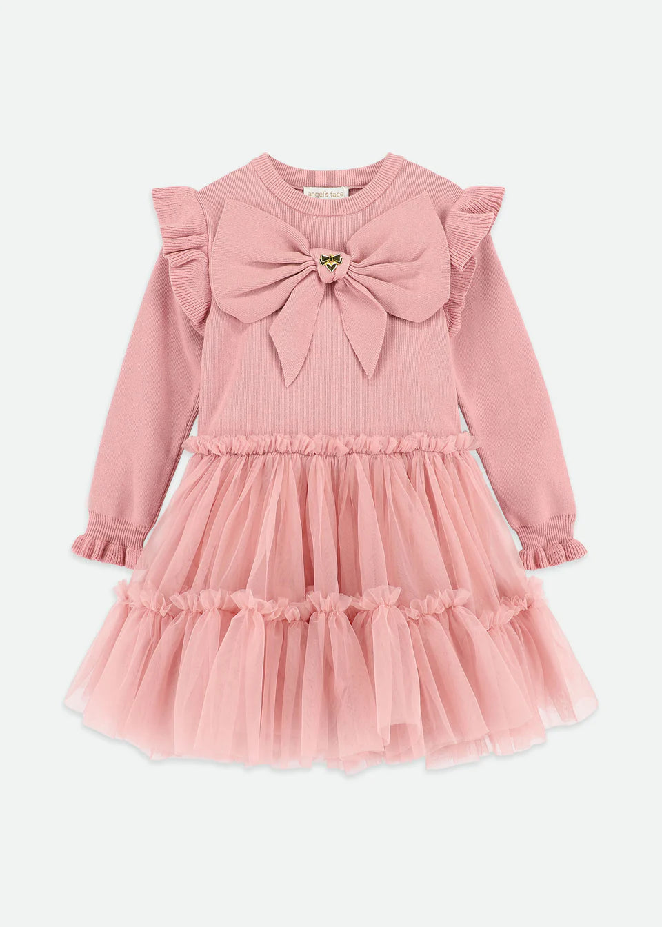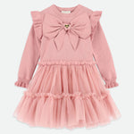Rendi speciale ogni giorno con questo splendido abito rosa per bambine. Il morbido corpetto in maglia di misto cotone presenta un grande fiocco vistoso sul davanti, decorato con il nostro esclusivo ciondolo a forma di cuore dorato. Deliziosi dettagli a balze decorano spalle e polsini, mentre la gonna è realizzata con strati di tulle arricciato per un volume extra e un effetto svolazzante. Perfetto per compleanni, feste o per vestirsi in modo elegante in qualsiasi giorno.
