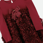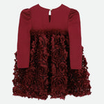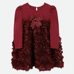 Splendido abito bordeaux con fiori 3D per bambina. Questo abito per occasioni speciali è perfetto per feste e celebrazioni. Presenta maniche lunghe in jersey e un morbido corpetto elasticizzato per un comfort che dura tutto il giorno, mentre la gonna è ricoperta da strati di splendide applicazioni floreali 3D per un look scenografico e strutturato. Completamente foderato in morbido cotone per una sensazione di morbidezza sulla pelle. Rifinito con un grande fiocco in grosgrain sul davanti, chiusura sul retro con bottoni dorati con logo.
