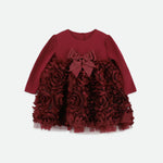 Splendido abito bordeaux con fiori 3D per neonata. Questo abito per occasioni speciali è perfetto per feste e celebrazioni. Presenta maniche lunghe in jersey e un morbido corpetto elasticizzato per un comfort che dura tutto il giorno, mentre la gonna è ricoperta da strati di splendide applicazioni floreali 3D per un look scenografico e strutturato. Completamente foderato in morbido cotone per una sensazione di morbidezza sulla pelle. Rifinito con un grande fiocco in grosgrain sul davanti, chiusura sul retro con bottoni dorati con logo.