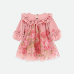 Splendido abito da neonata in tulle floreale rosa. Questo voluminoso abito in tulle è perfetto per feste o occasioni speciali. Maniche lunghe a sbuffo con polsini elasticizzati, volant lungo il carré e la scollatura e morbide arricciature creano una silhouette elegante. Interamente foderato in morbido misto cotone elasticizzato. L'abito è completato dal nostro fiocco esclusivo, con chiusura sul retro con un bottone dorato.