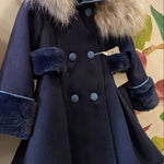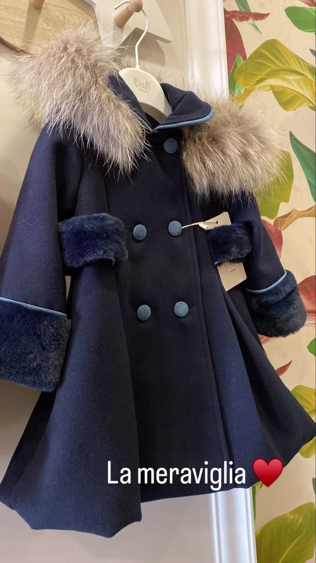 Elegante cappotto in panno dal taglio svasato, arricchito da morbidi polsi in pelliccia e un cappuccio bordato con pelliccia originale. Questo capo sofisticato unisce stile bon ton e attenzione ai dettagli, ideale per offrire comfort e raffinatezza nelle occasioni più eleganti per la tua neonata.