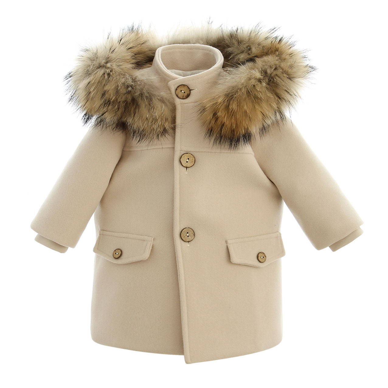 Questo cappotto in panno con cappuccio e pelliccia originale è concepito per garantire eleganza e comfort al neonato durante le occasioni speciali. Le finte tasche sul davanti e i bottoncini in legno danno un tocco raffinato, mentre il design curato completa ogni outfit con stile senza rinunciare alla praticità. Perfetto per mantenere il piccolo al caldo con classe.