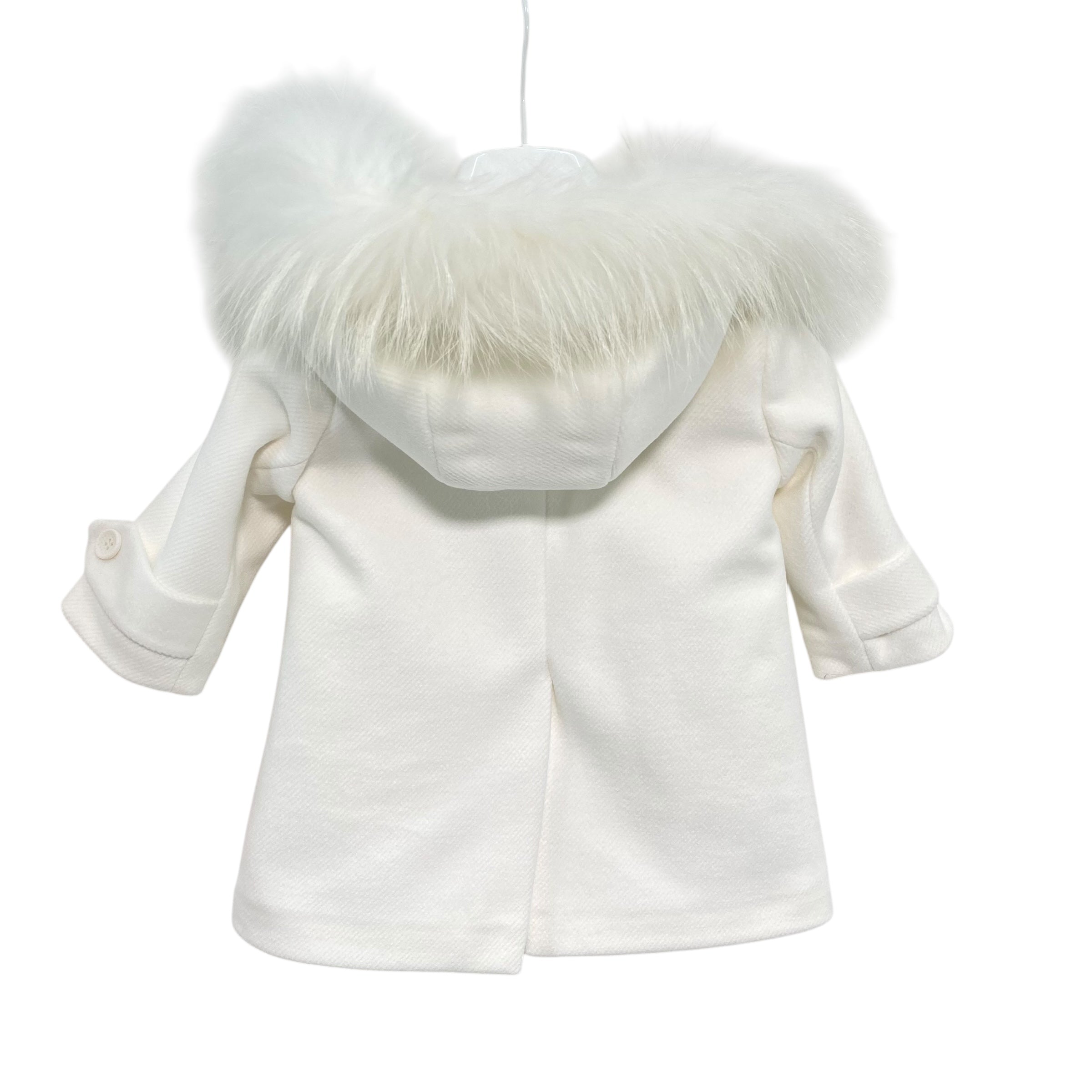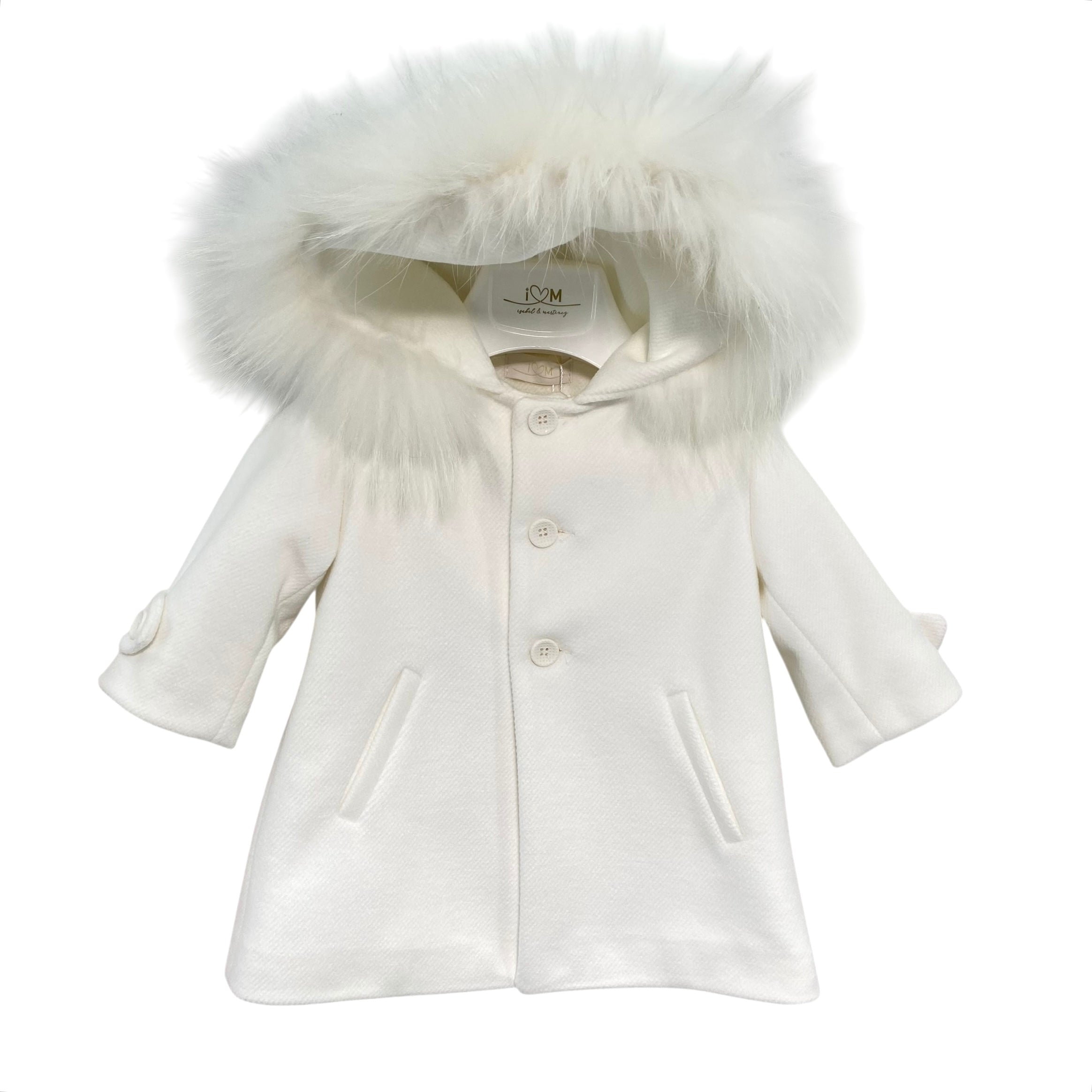 Questo cappotto in panno per neonato, si distingue per l'eleganza raffinata del suo design, arricchito da un cappuccio impreziosito da pelliccia morbida. Perfetto per completare outfit sofisticati, offre comfort e stile ideale per occasioni formali o giornate di festa, garantendo al bebé un aspetto curato senza rinunciare al calore e alla protezione dal freddo.