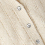 Cardigan in misto lana, in tinta unita, con traforature e bottoni similgioiello.