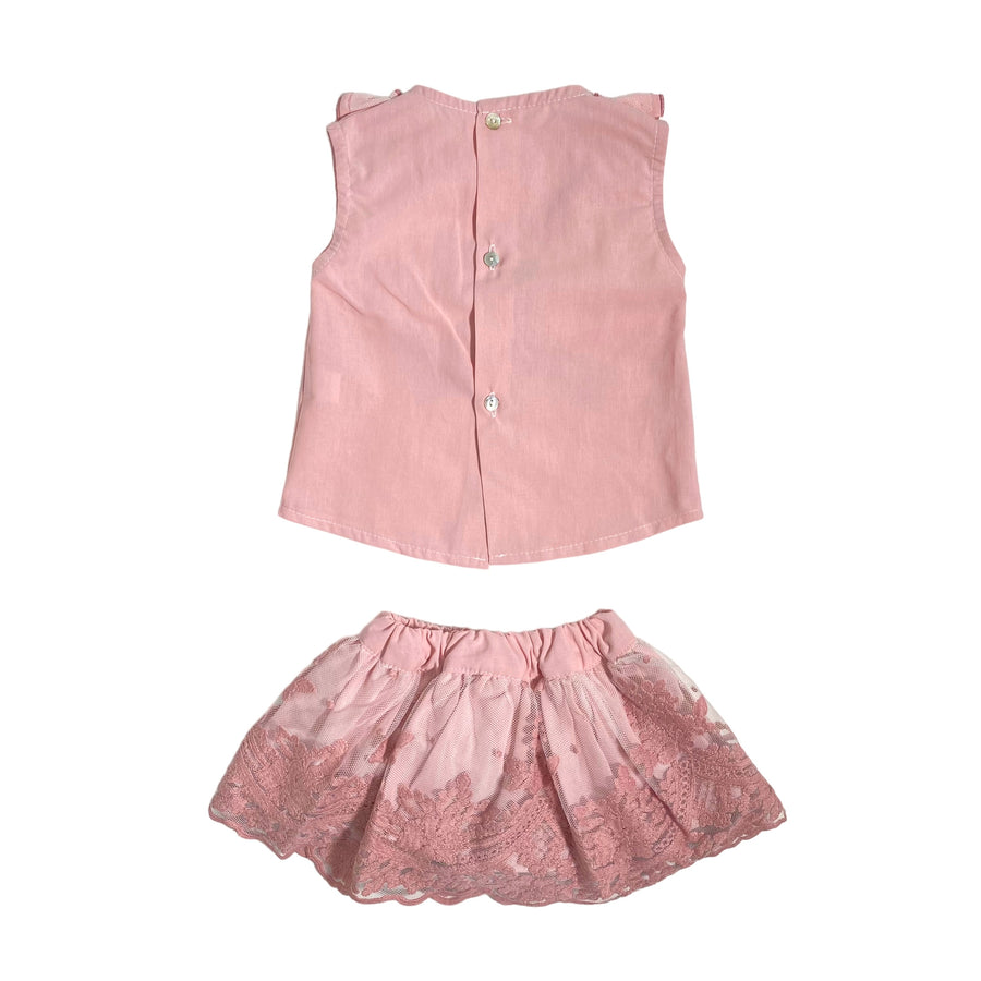 -blusa smanicata in cotone ,arricchita sul davanti da rouches in cotone e tulle e fiocco in grois grain ,apertura sul retro con bottoni in madreperla