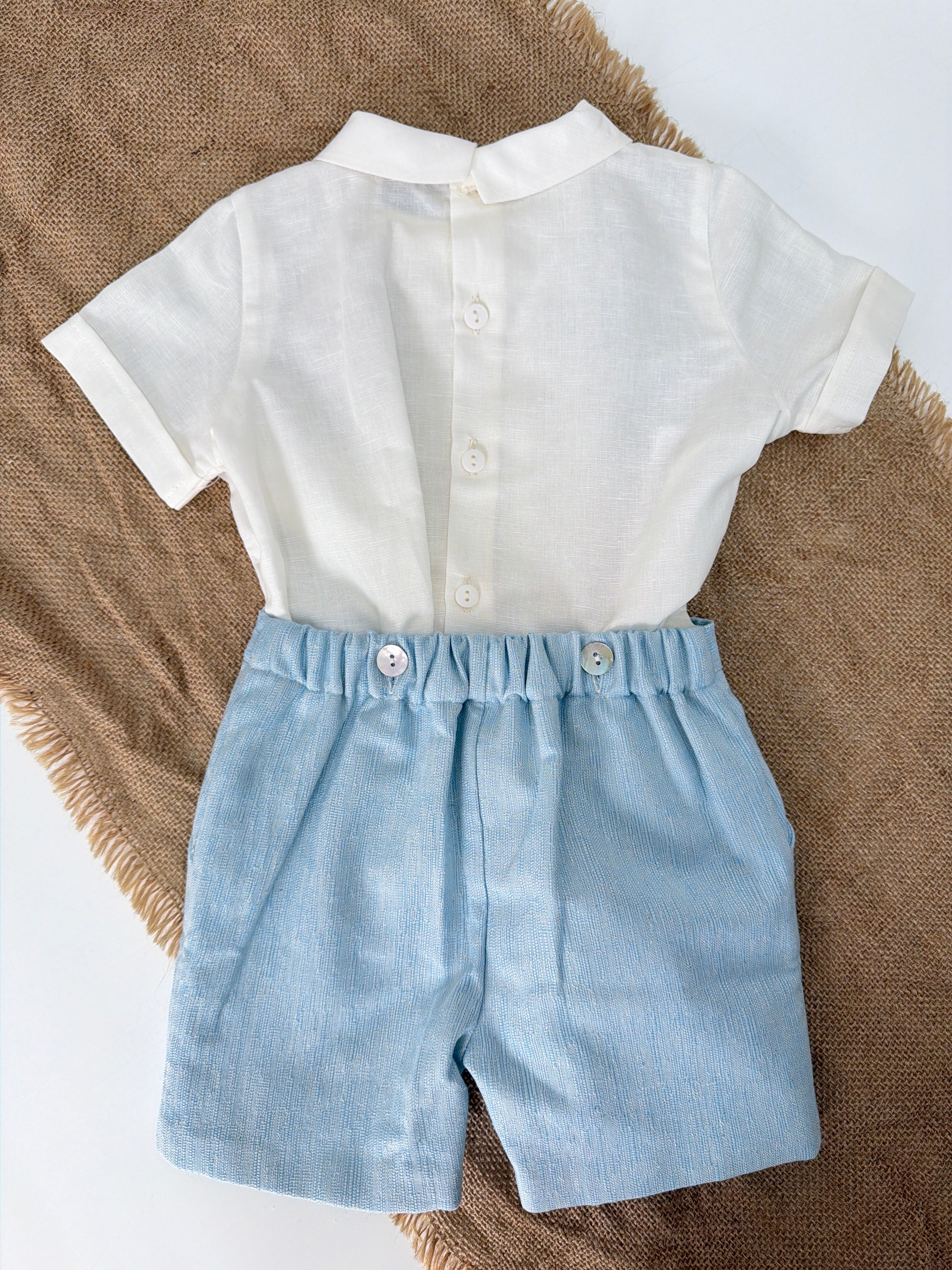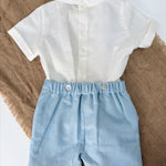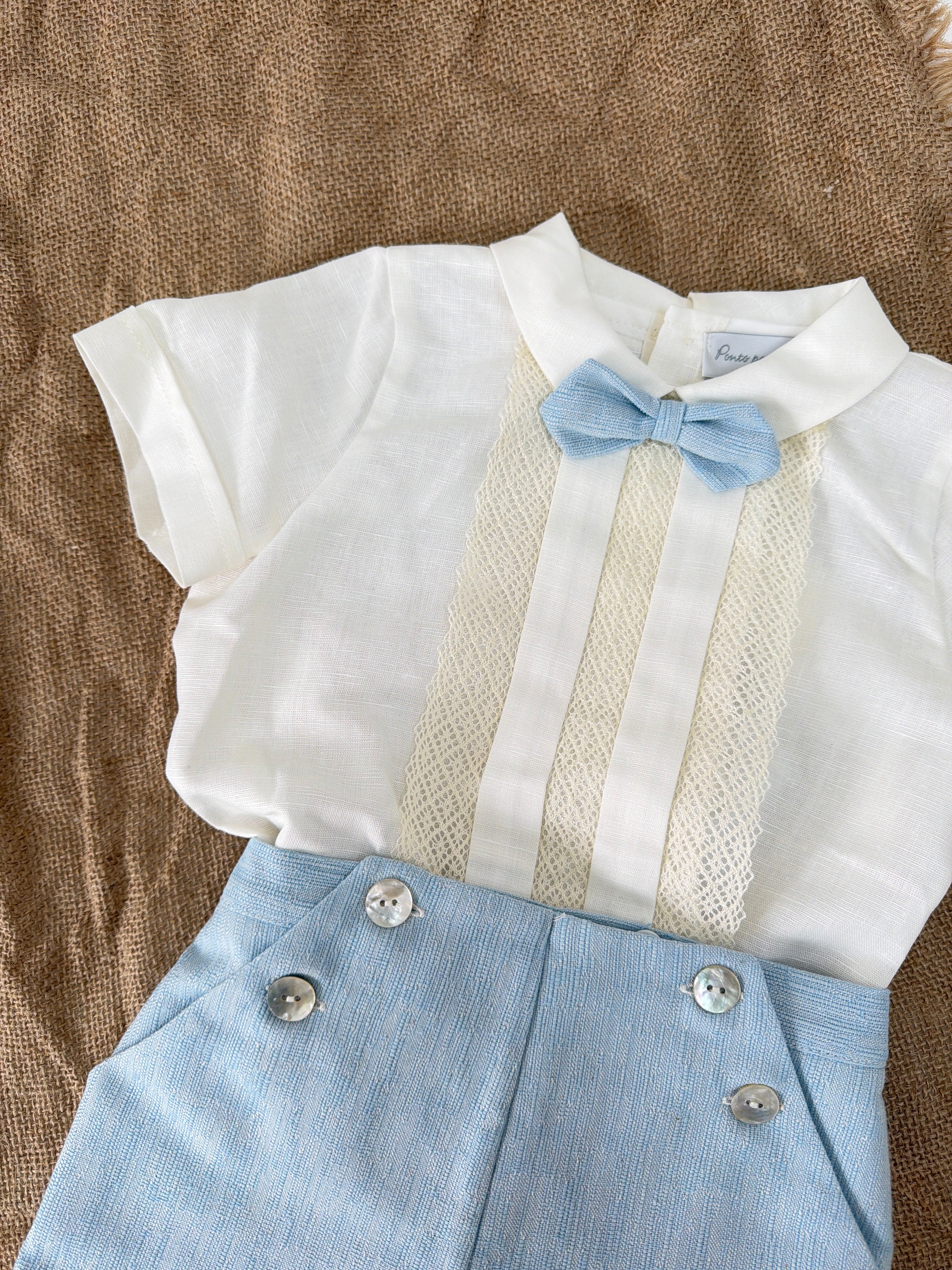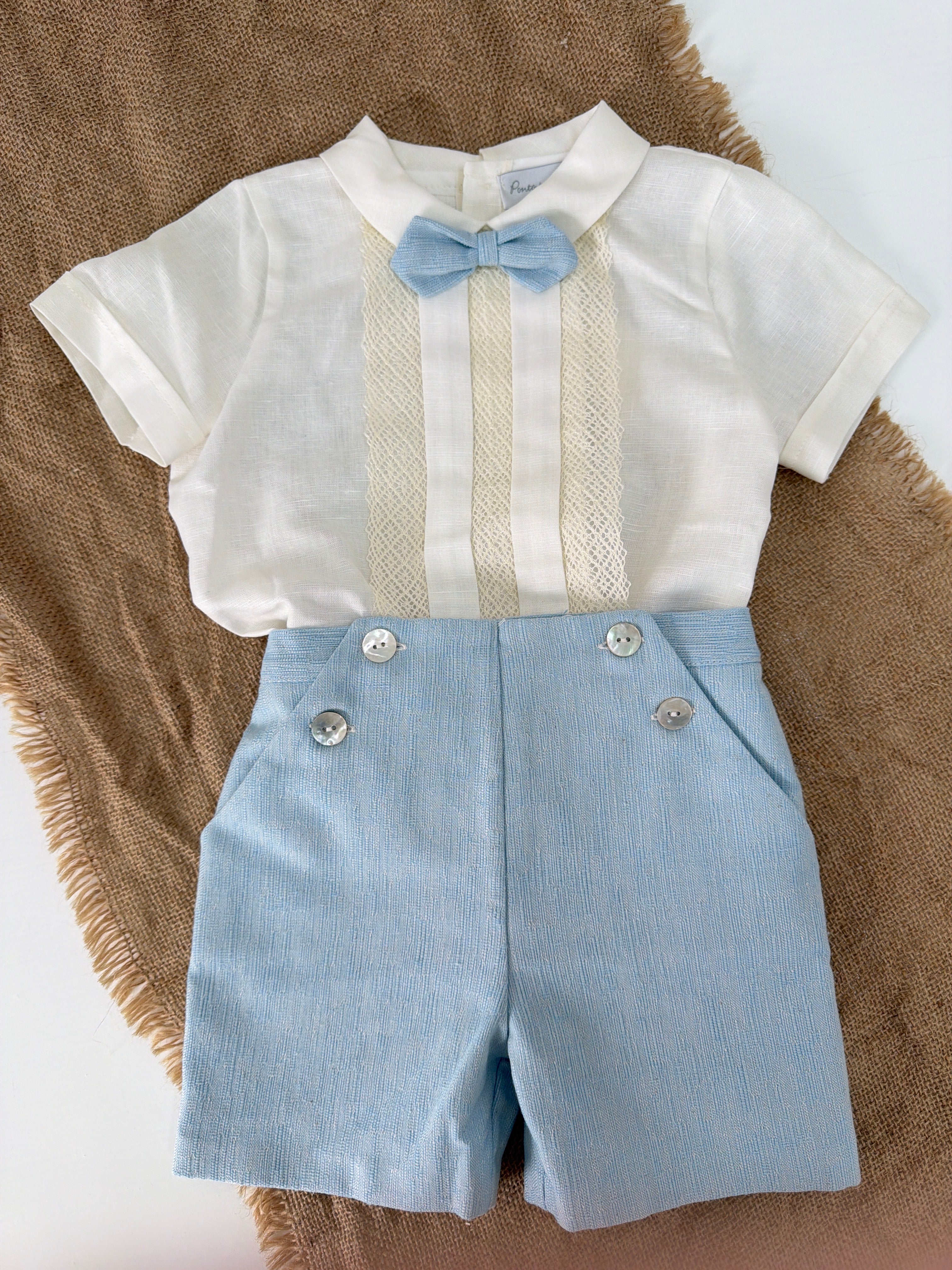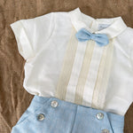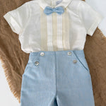 Questo elegante completo in cotone è perfetto per le occasioni speciali del tuo neonato. Il bermuda in tessuto particolare e la camicia mezza manica sono impreziositi con applicazioni di pizzo sul davanti. Completa il look con il papillon abbinato per un tocco di stile.