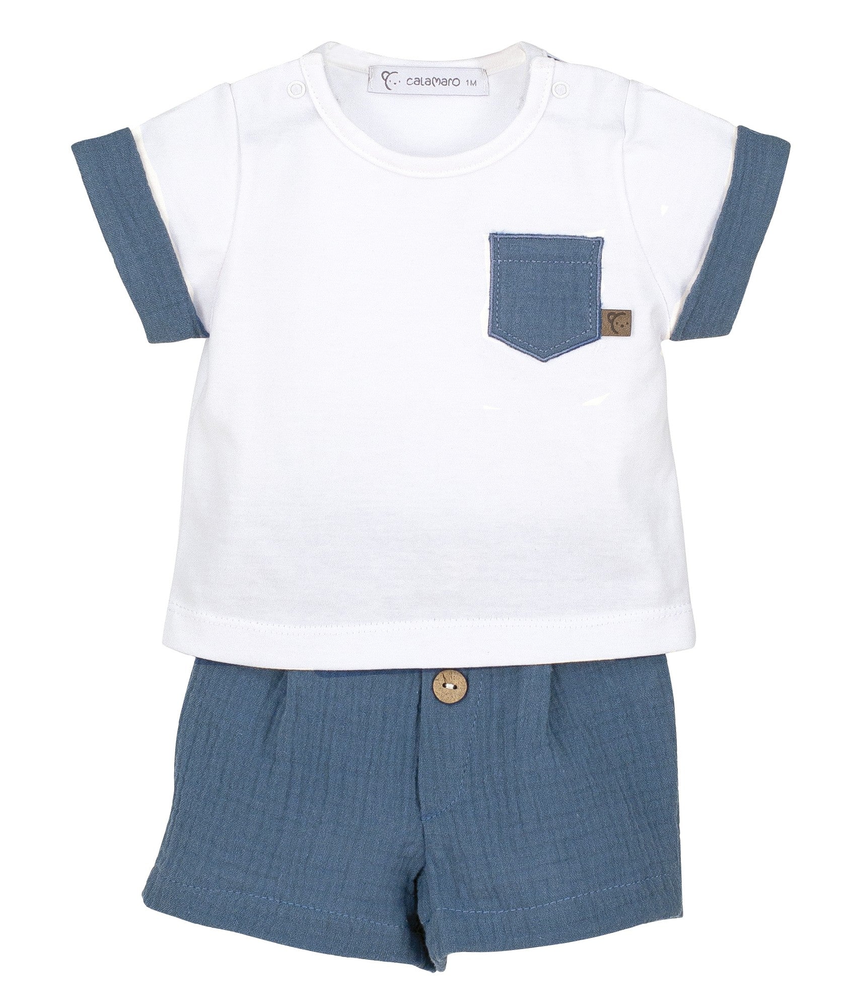 -maglia mezza manica con taschino in cotone tinta unita bianca con dettagli bluette