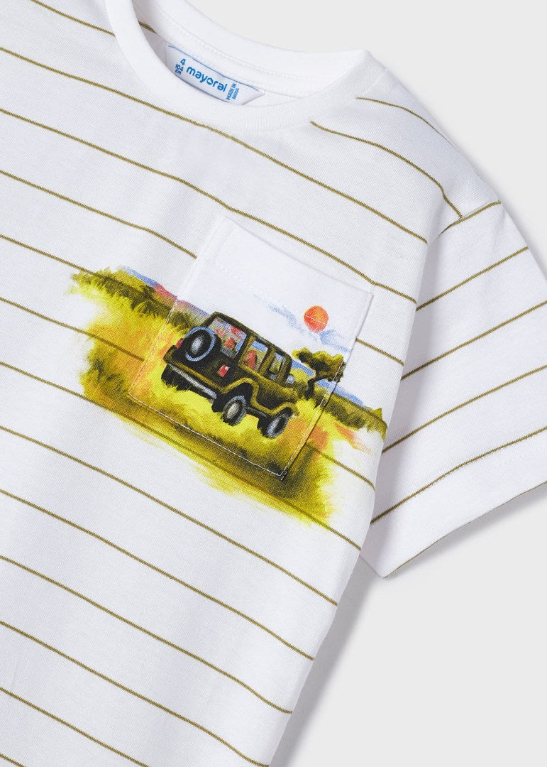 Capo ECOFRIENDS 100% cotone sostenibile Maglietta manica corta per bambino. Girocollo. Tasca funzionale nella parte anteriore. Trama a righe.