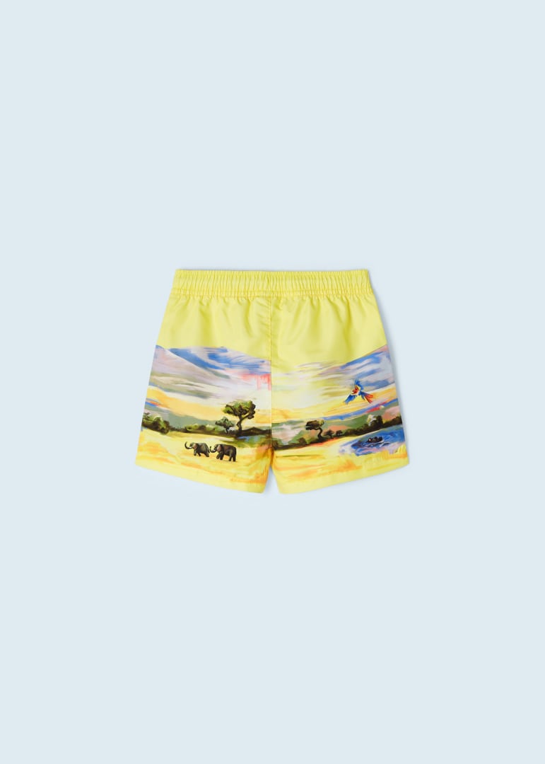 Capo ECOFRIENDS 100% poliestere riciclato. Salopette corta per bambino. Vita con cordoncino regolabile Design stampato.