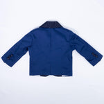 Giacca da cerimonia realizzata in cotone di qualità superiore, caratterizzata da un elegante colore blu chiaro che la rende versatile e sofisticata. I rever in raso blu notte aggiungono un tocco di raffinatezza e contrasto, creando un dettaglio di pregio. La chiusura con bottone garantisce praticità e un'estetica pulita. Perfetta per occasioni speciali, questa giacca combina comfort e stile, ideale per il guardaroba formale del bambino.