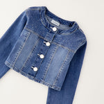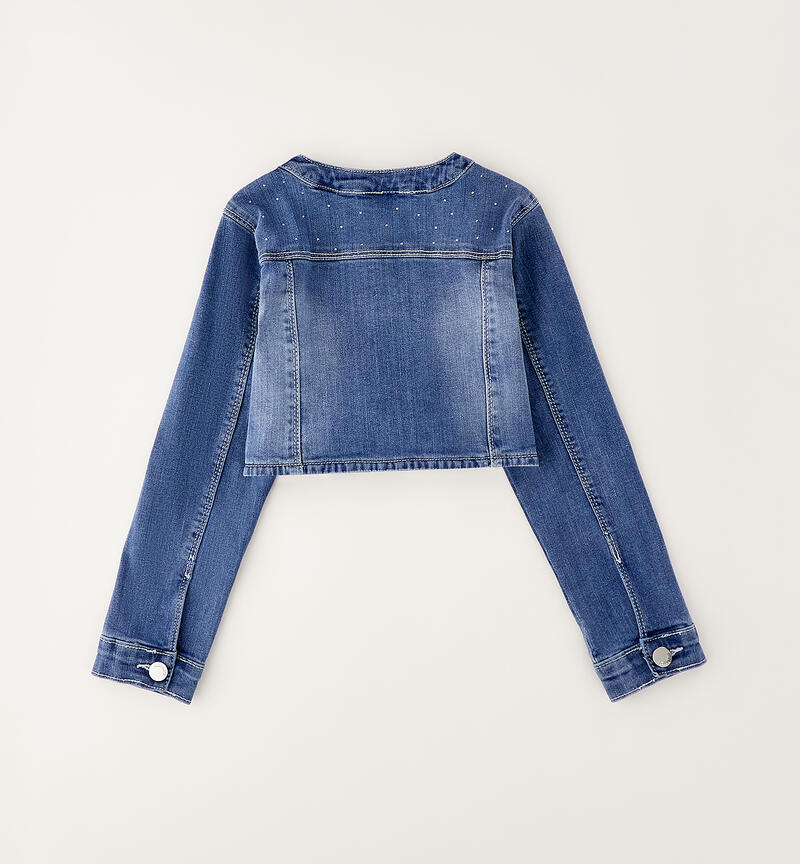 Giacchetto per ragazza Sarabanda realizzato in denim stretch di cotone arricchito da strass. Apertura con bottoni