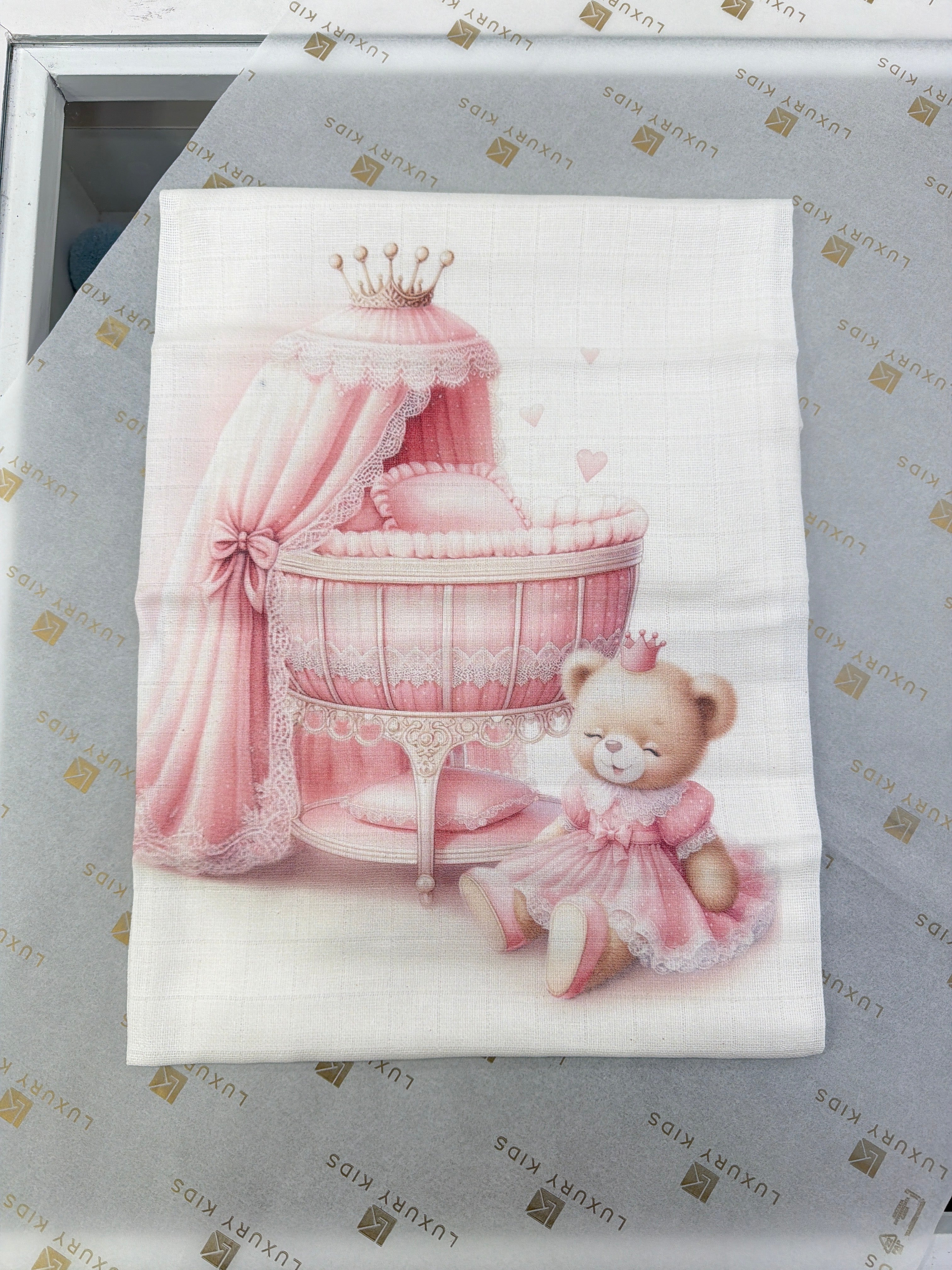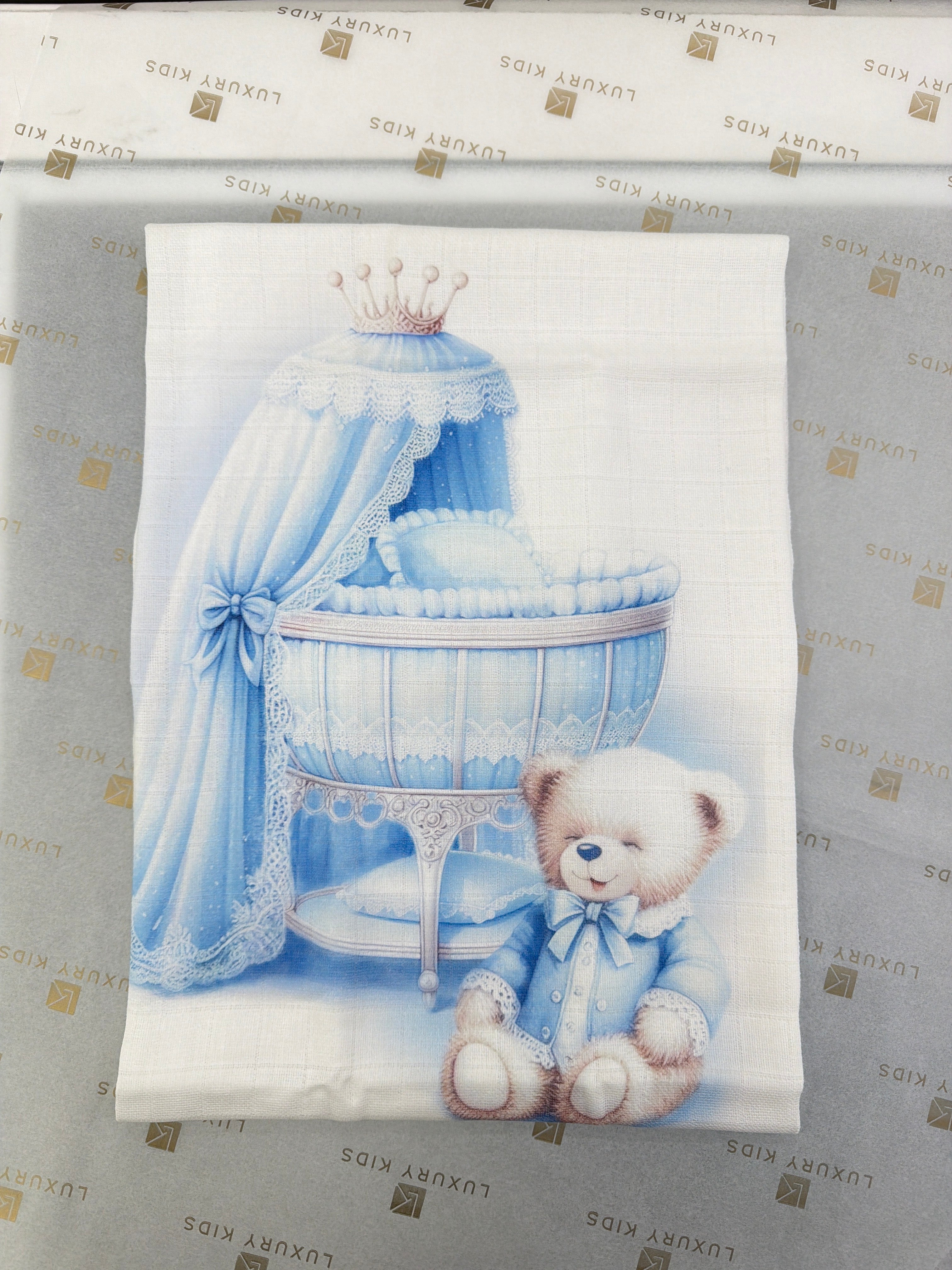 Praticità ed eleganza si uniscono in questa Mussola in Cotone con Stampa Di Culla Con Orsetto Neonato/a FIRST BABY MUSLIN4. Realizzata in morbido cotone e disponibile nella dimensione 80*80cm, è perfetta per il corredino del tuo neonato/a. La stampa culla con orsetto aggiunge un tocco di stile alla sua utilità.