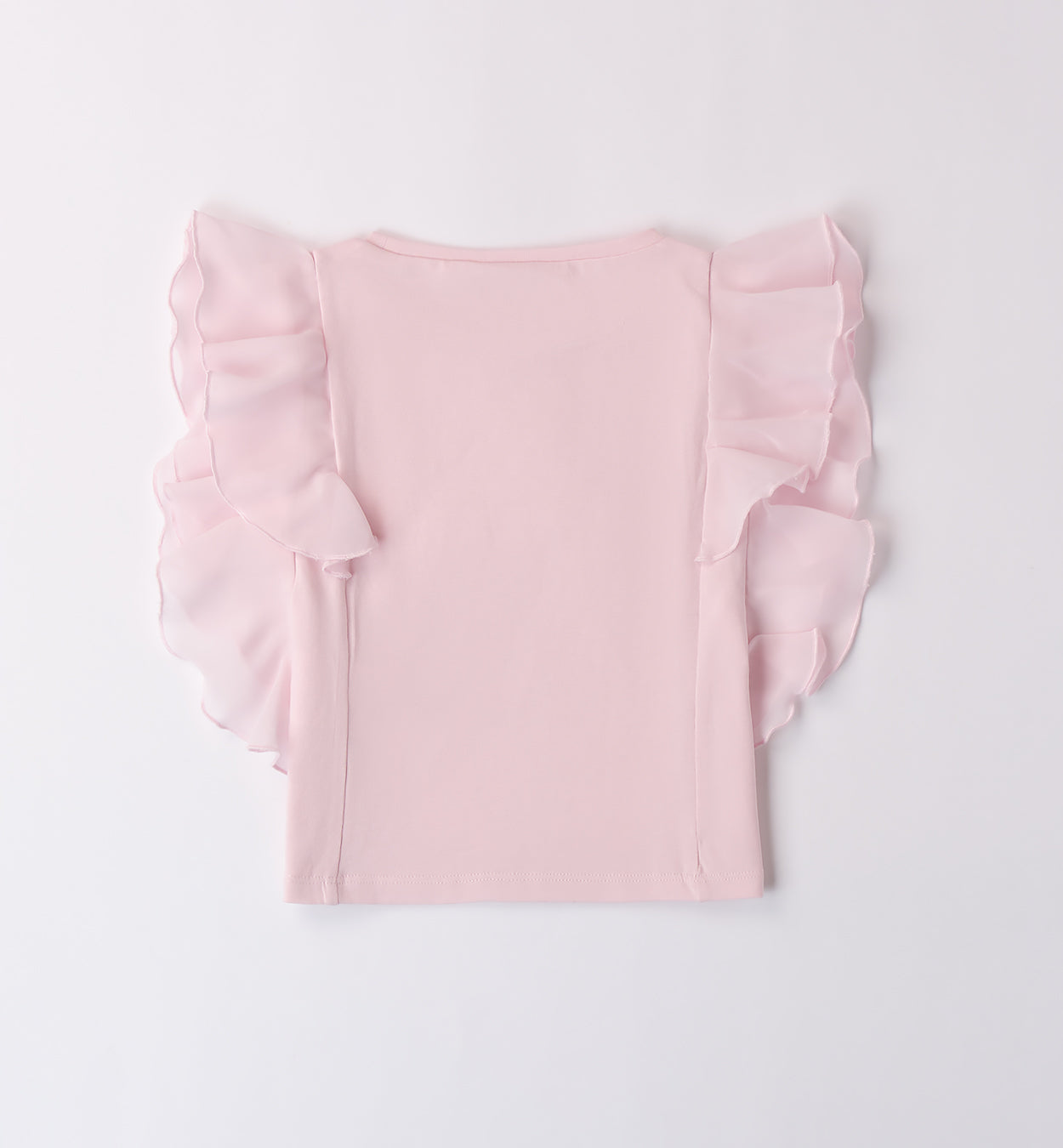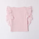 T-shirt Sarabanda per bambina realizzata in jersey stretch di cotone. Il modello presenta apertura sul retro con bottoni e maniche con ruches.